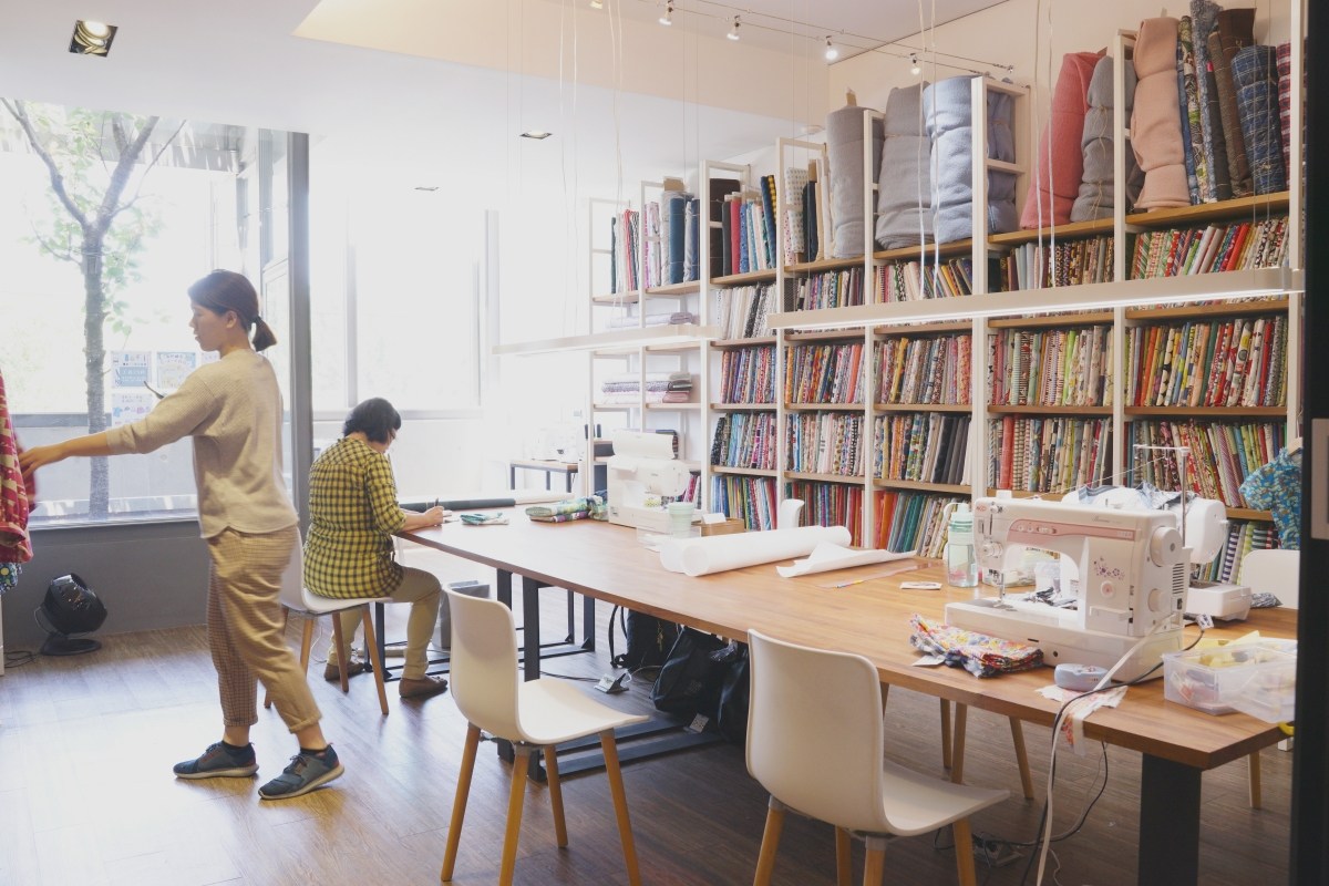 牆上有滿滿的布料,透著自然光線,使得每個來到這踩著縫紉機的人,都能在過程中感受今天的天氣,不論是暖洋洋的日光,還是聽著滴答的雨聲,將喜悅縫進,把悲傷抽走。