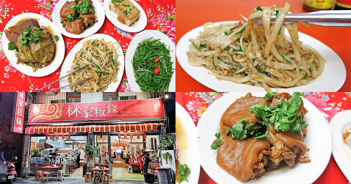 美濃最為人知的就是這個有粄條一條街稱呼的「美興街」,短短一條路上有數十家粄條店,每一家都各自有其特色風味,假日用餐時間還要排隊才能一嚐美味,不只是在地人愛吃,連台北、台中的觀光客都特地前來,這次介紹的這家「林家粄條」是在地老店,民國55年開始營業,目前還在念大學的第四代也開始加入經營,當地人推薦豬飛一定要來嚐嚐,自製油蔥酥和傳統的客家料理都是店內招牌,像是豬腳、高麗菜封、炒水蓮、花生豆腐,還有炒粄條,每一道都美味的讓人難忘。