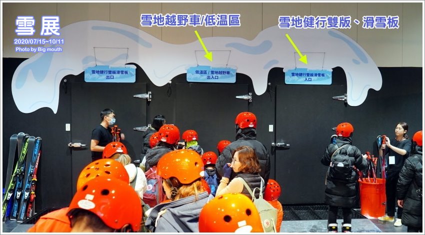 ▼穿好外套、鞋子之後,記得戴上安全帽以策安全!這裡有三個出入口,最左側是出口,中間是雪地越野車及低溫區,右側則是雪地健行雙板、滑雪板、親子拉雪橇體驗,通常雪地越野車是最熱門的,如果不想久候的朋友也可以從中間進入先玩其他設施(飛碟滑雪胎、雙人雪地香蕉船、三人PIZZA滑雪船、施諾奇平衡車、無輪雪地滑板車、幼幼滑雪盤、冰風暴大挑戰等),最後再來排雪地越野車會比較有效率!