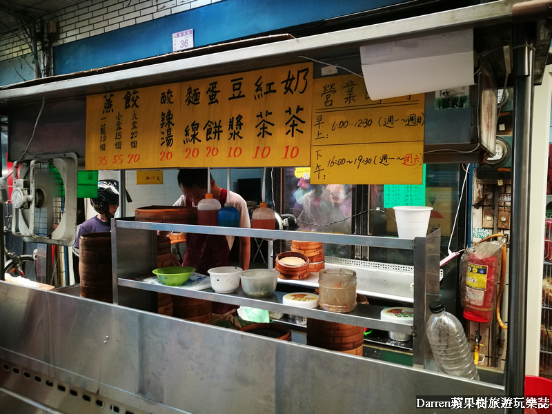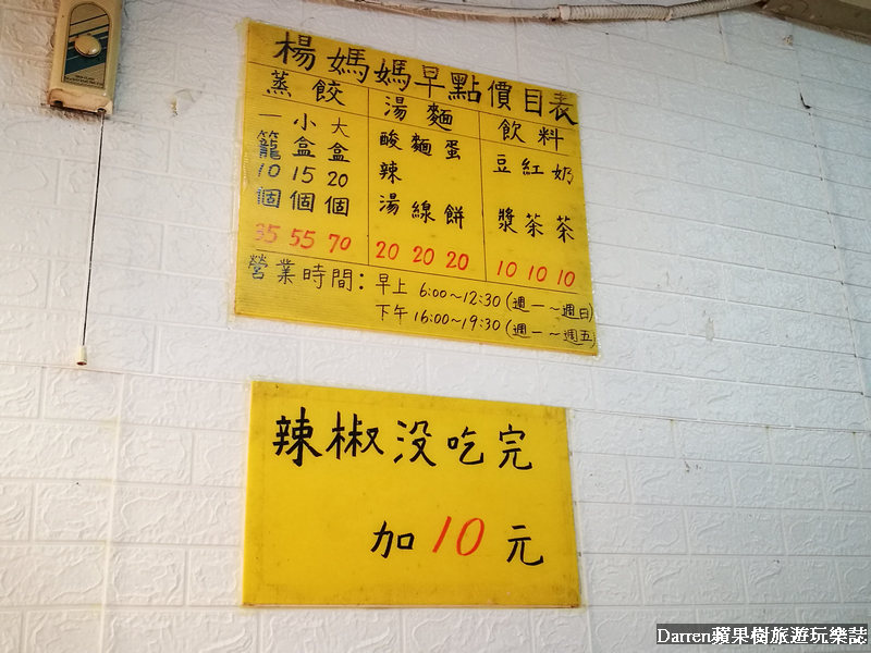 大湳市場蒸餃菜單上寫著楊媽媽早點價目表,一籠蒸餃10個35元,下面還寫著辣椒沒吃完加10元,這樣一說還真得要試試他們家的辣椒
