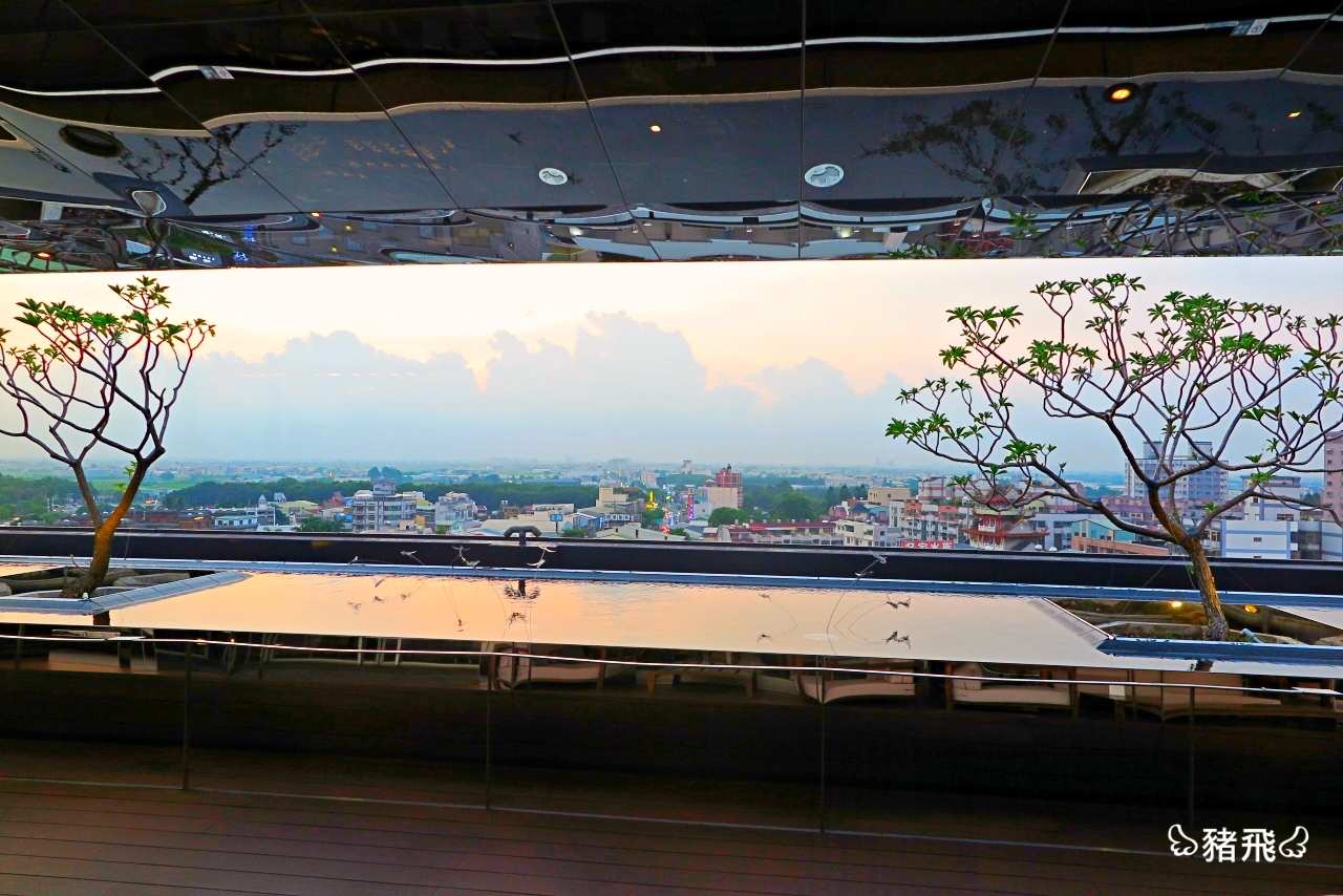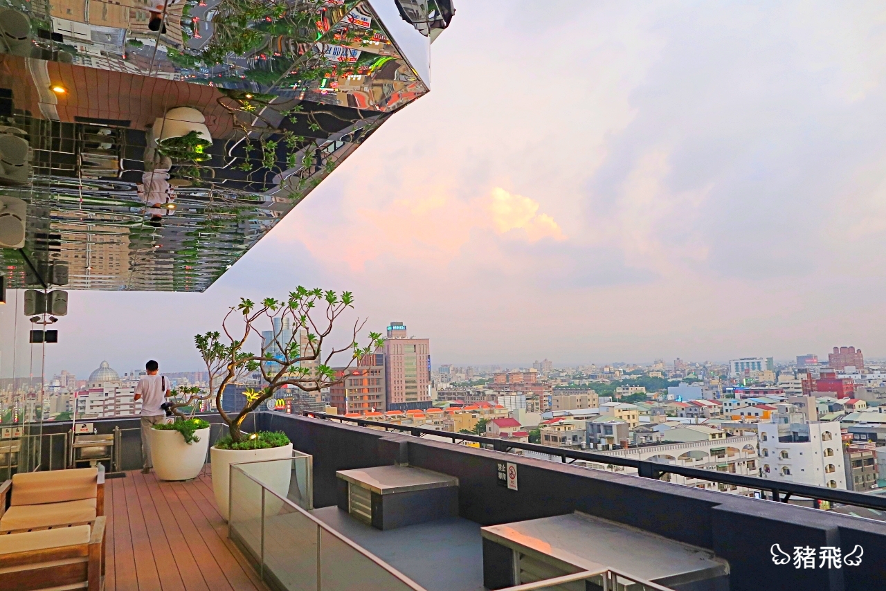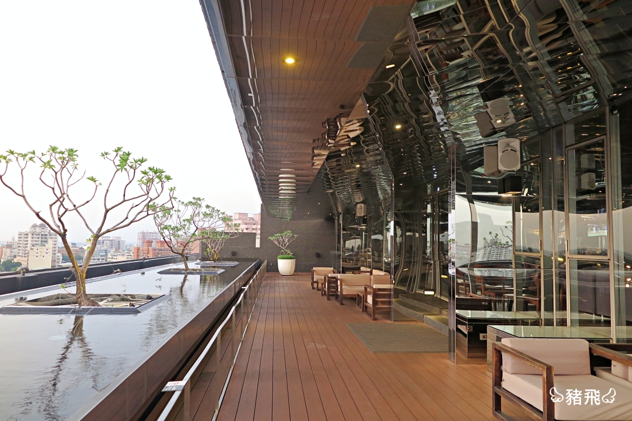飯店R樓的高空酒吧擁有270度環繞風景,可以鳥瞰嘉義市金黃夕陽與夢幻夜景,戶外水池中的白水木大型植栽,讓人彷彿身處大自然中,清澈的造景水池倒映著白雲,形成水天一線的美麗景象。空間沿續飯店的時尚裝潢風格,整個場域用不鏽鋼鏡面環繞,搭配木質桌椅,有種身在曼谷高空酒吧的錯覺呢!