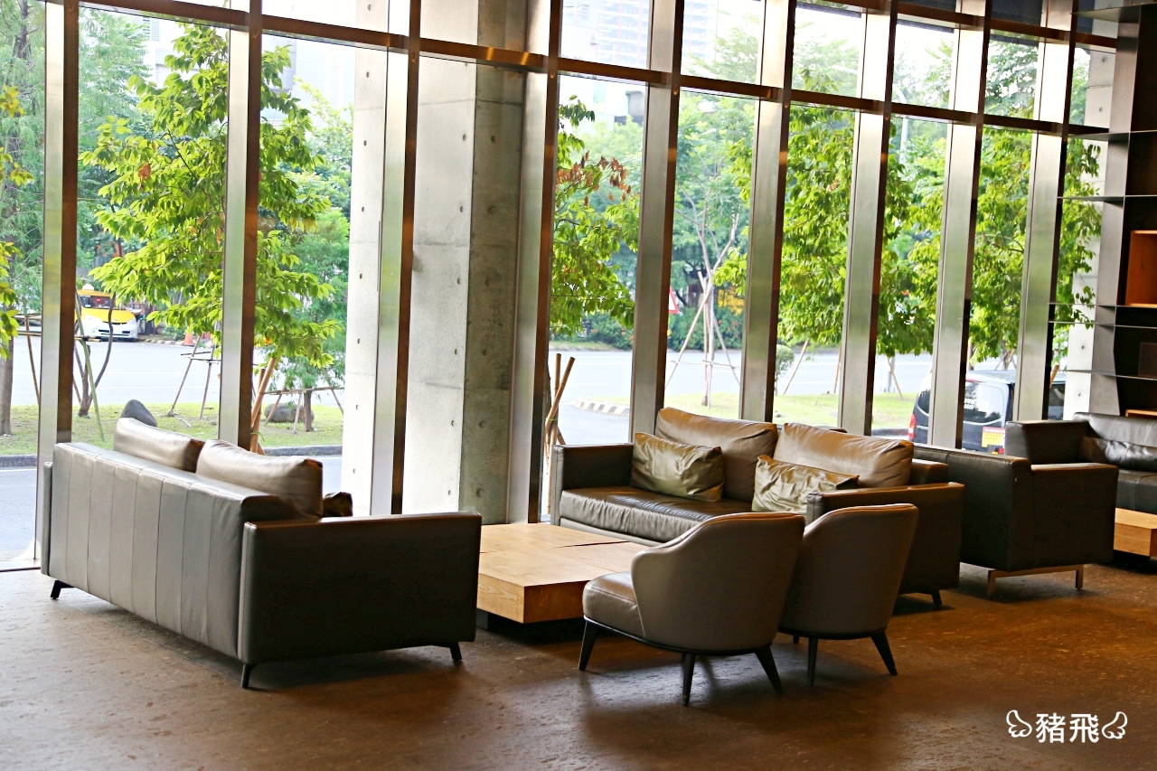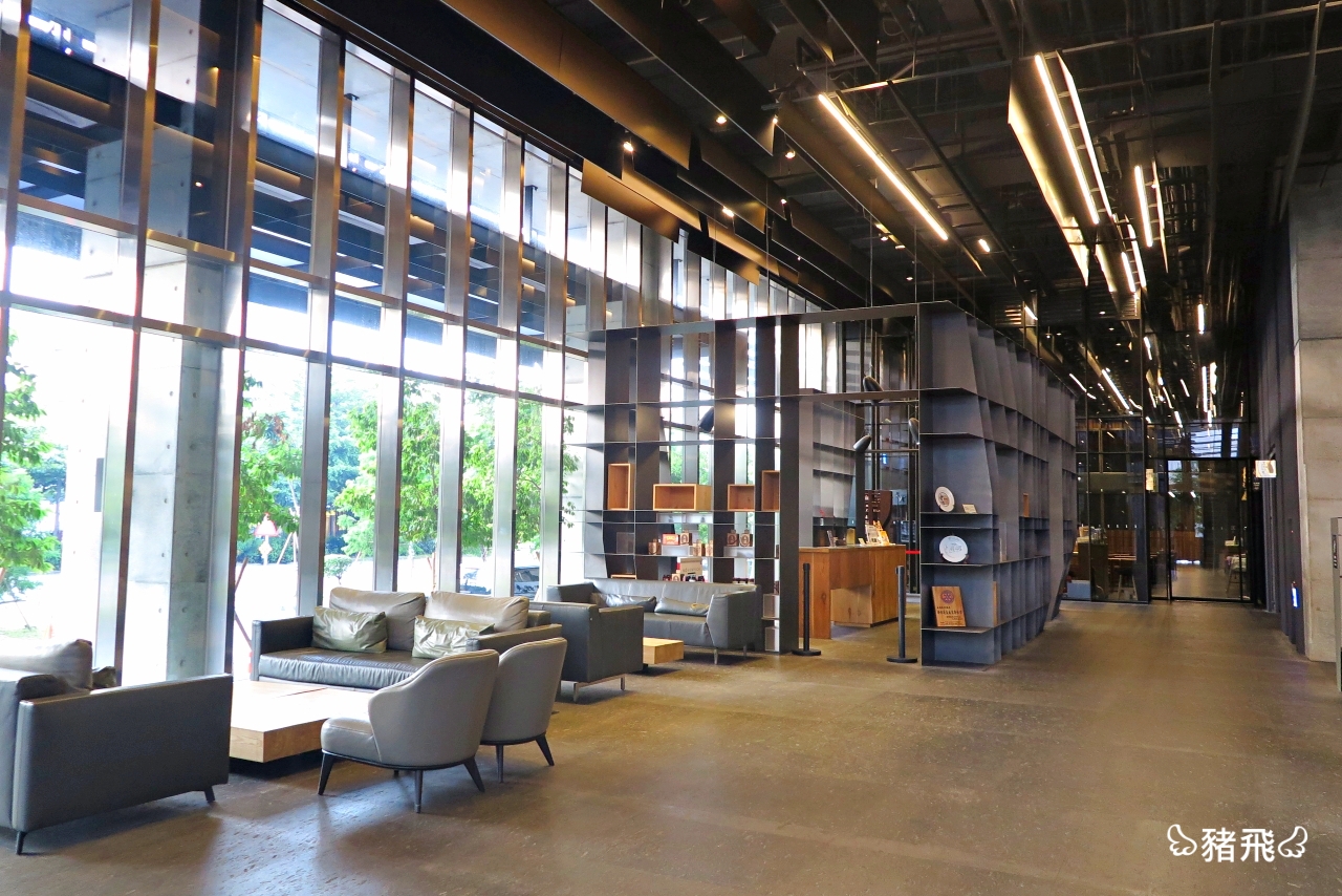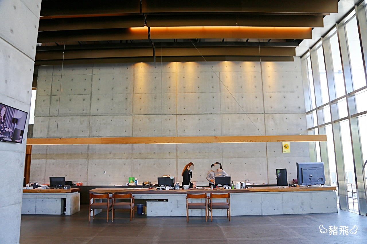 一樓大廳7米3的挑高空間讓視覺寬敞穿透,窗外綠意盎然的植栽與灑落的陽光,增添了幾分柔軟,格柵式的落地玻璃延伸自建築物外觀設計,從裡到外風格更一致。迎賓櫃檯使用原木設計,清水模與原木搭配顯得自然質樸,可以窺見向當代建築大師安藤忠雄致敬的清水模風情。大廳沙發座椅凸顯大器舒適,融入閱讀空間與商務空間,少了隔間屏障,讓走進來的每位旅人感受到恬靜放鬆的日式氣息。隨著櫃檯人員親切的招呼聲,開始了在這裡的度假時光。