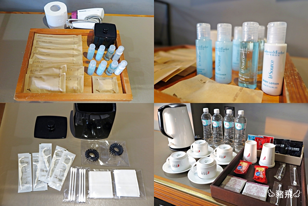 備品齊全,整齊的放在實木盤上方,更顯質感。嘉楠風華酒店是嘉義地區獨家授權英國進口瑰珀翠沐浴用品的飯店,豬飛身為瑰柏翠的愛用者,真的是超級讚賞飯店眼光(笑)。茶包、礦泉水、咖啡、茶點、飲料都是免費使用。