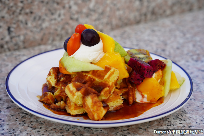▲▼家適咖啡鬆餅有著誠意份量十足的水果當盤飾,上面淋上焦糖鬆餅外酥內軟,很適合搭配茶飲或咖啡一起享用
