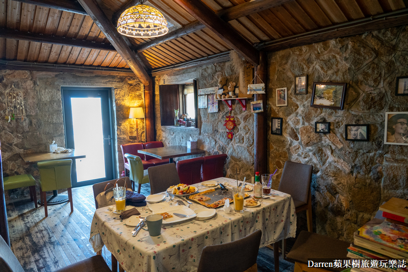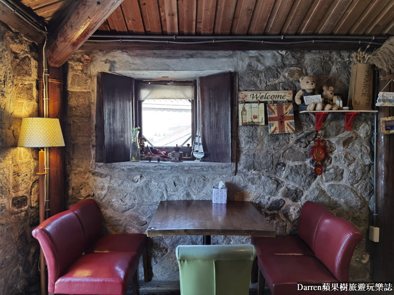 ▲▼走進家適咖啡裡頭閩東石頭式建築,融入歐式鄉村風格裝潢,古典沙發座椅、彩色琉璃燈、可愛的碎花布桌布加上粗曠石頭牆面形成渾然天成的自然美感,活潑生動的色調以及原始質感給人一種溫馨又浪漫的印象