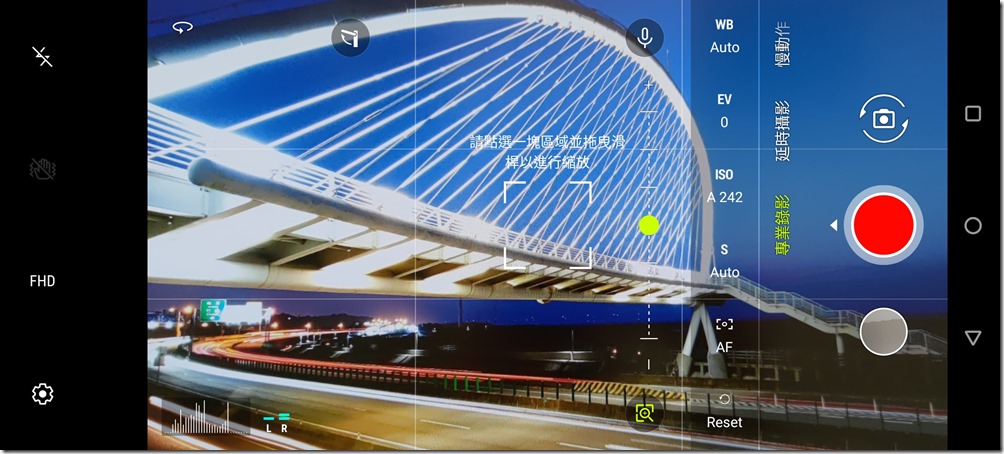另外還有個非常厲害的功能,一般錄影變焦功能,都只能針對中央進行放大縮小,但 ASUS ZenFone 7 的專業錄影模式可以針對畫面中的特定區域進行放大,旁邊的綠點可控制定速放大縮小的速度,這功能非常實用。