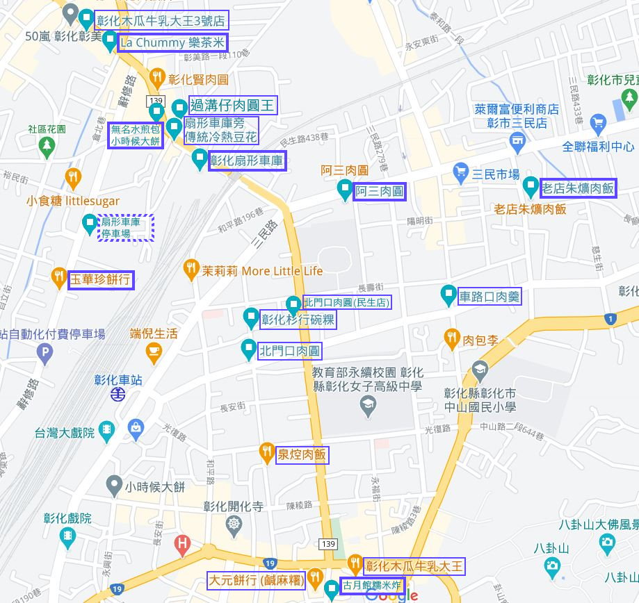 ▼彰化扇形車庫美食一日遊好吃好買的地圖底加啦~~粗框的是大口建議必吃的,細框則是有時間可以去吃吃看,其中只有泉控肉飯當天沒開所以沒吃到,但也是在地友人推薦的美食,有機會再來去吃一下!開車的朋友可以像大口一樣停在扇形車庫停車場,走過去約5分鐘即可到達,附近也有不少美食在等著大家啊~~~很多都是走路即可到達,光是這週邊就可以吃好買滿啦!