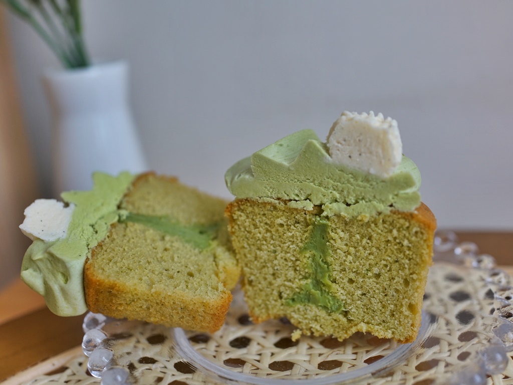 主體為抹茶蛋糕,口感扎實,有加入少許的抹茶卡士達內餡,吃起來更加濕潤有層次,抹茶味道不會很重,是淡淡的清香,蛋糕上面是融入日本靜岡抹茶的奶油起士霜,帶點鹹味的奶油起士很加分,微微的點綴讓整體不會過於甜膩,顛覆我對杯子蛋糕精緻難以入口的想像!