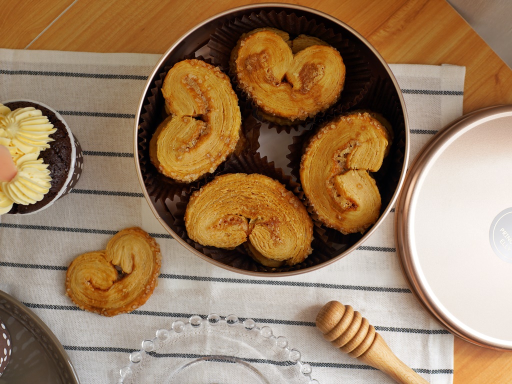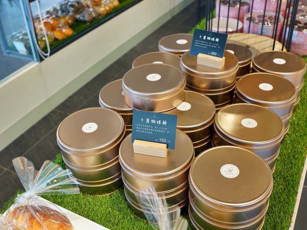 千層蝴蝶酥使用天然發酵奶油製成,無人工添加物,吃起來充滿細緻的奶油香氣,搭配糖粒帶來層層香酥脆的口感,經典的法式點心加上玫瑰金鐵盒包裝,特別適合送禮呢!