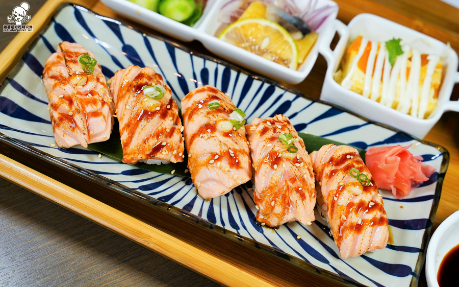 很肥美的炙燒鯖魚,細膩手法炙燒、保有外皮焦香脆度,可以沾胡椒鹽或者檸檬提味