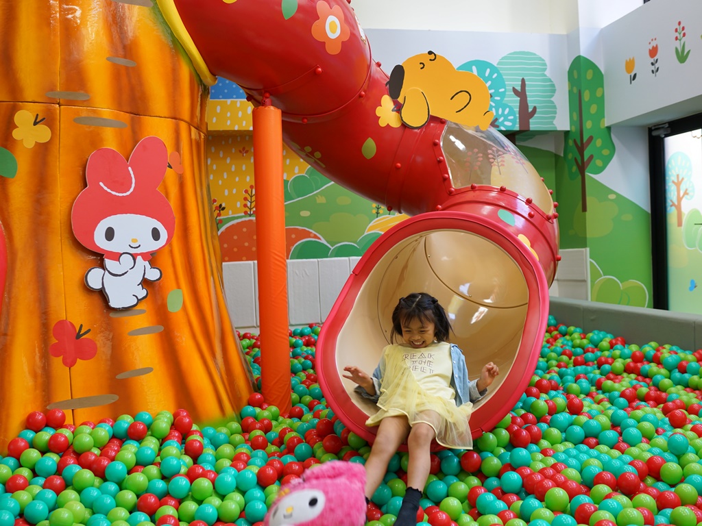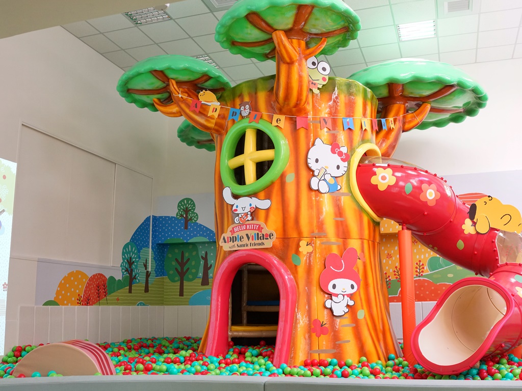 最後是【三麗鷗夢想蘋果樹】,蘋果樹象徵蘋果村的精神,搭配小孩最愛的溜滑梯超好玩,還有彩色大球池與互動投影遊戲體驗,我女兒幾乎一半時間都待在這區,玩到捨不得離開啊~