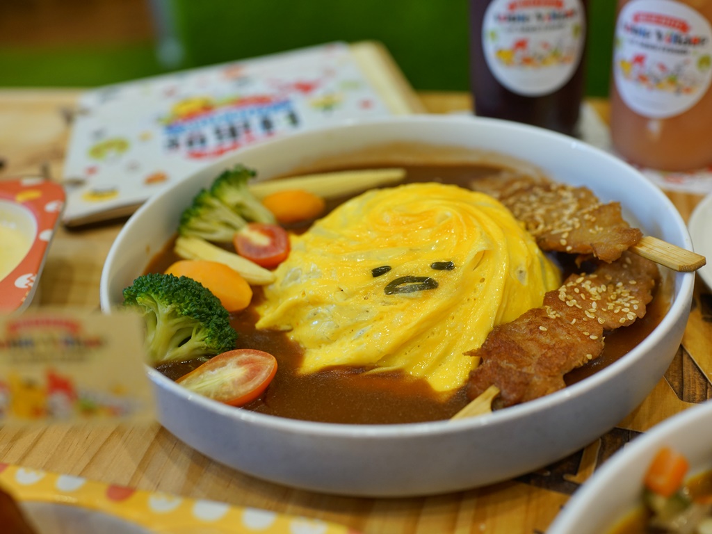 慵懶的蛋黃哥躺在盤中真是逗趣啊~螺旋蛋包裡面是口味偏淡的番茄玉米飯,一旁的豬里肌肉串也是建議趁熱享用~