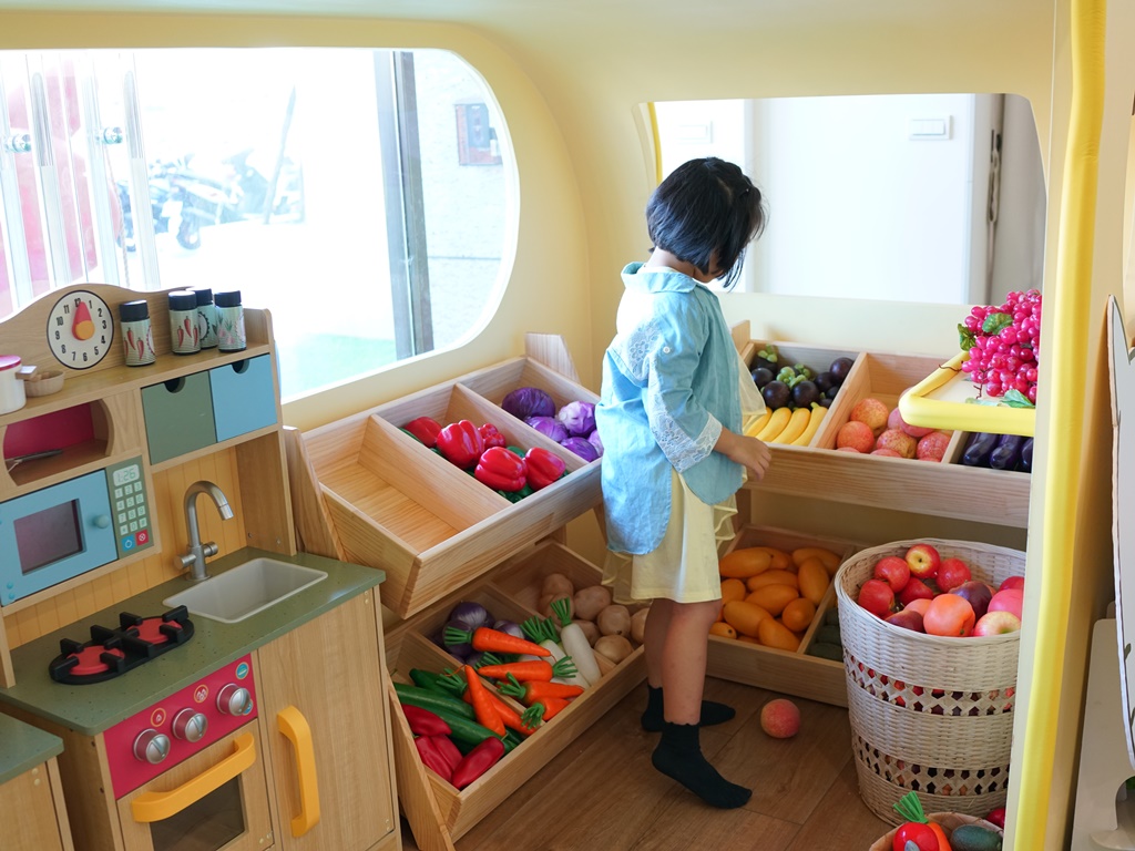 【布丁狗野地露營車】裡面有精心設計的小農市集,讓孩子體驗採買食材的樂趣,還有設備齊全的廚房玩具!
