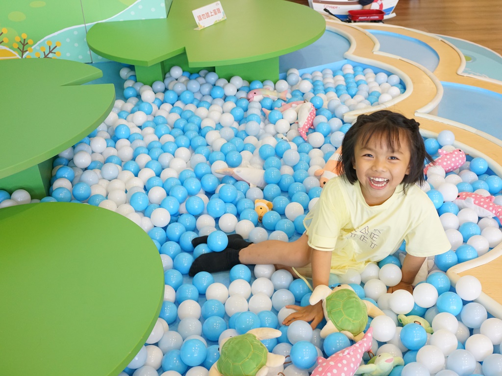 【大眼蛙歡樂雨滴池】以藍白色系的球營造出海洋的感覺,並放置許多魚、海豚、烏龜娃娃,讓小朋友體驗釣魚樂趣!