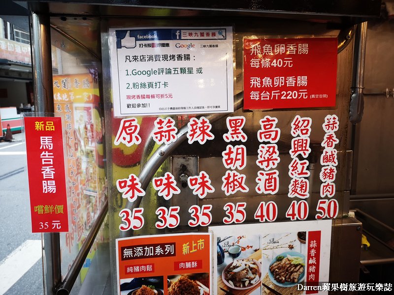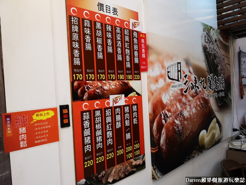 三峽九鬮香腸有招牌原味、蒜味、高粱酒、黑胡椒、辣味、馬告、紹興紅麴及高粱酒等多種口味,另外也有賣蒜香鹹豬肉以及紅麴肉等等