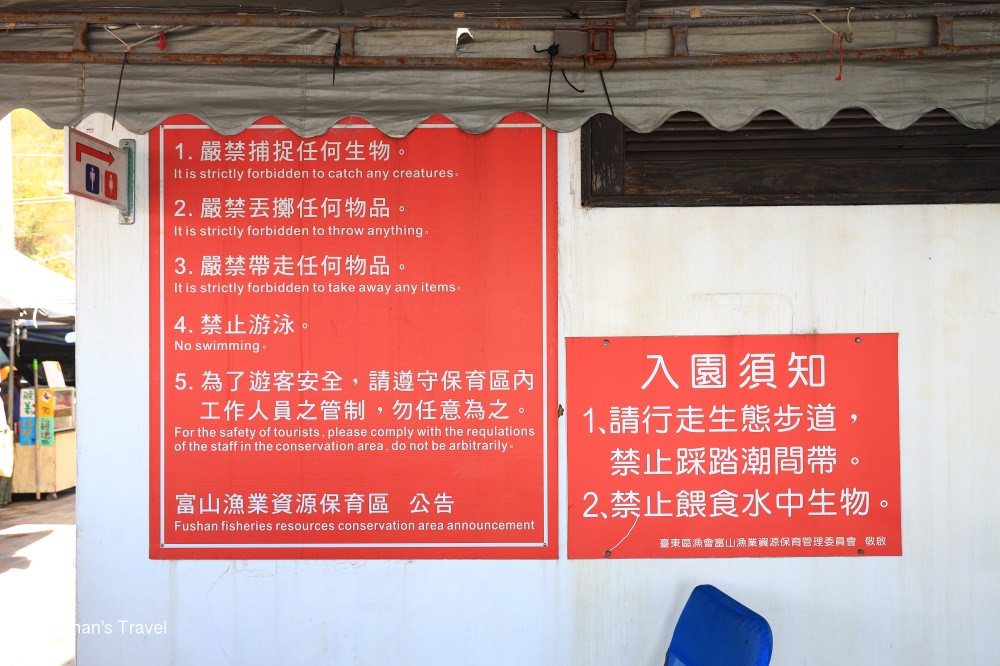 富山護漁區和別的海水浴場不同,這裡是屬於漁業資源保育區,所以有很多旅遊限制,包含游泳、丟擲物品、抓魚捕魚⋯等行為通通不行,也不可以走進潮間帶,也不可以自備麵包飼料來餵魚。