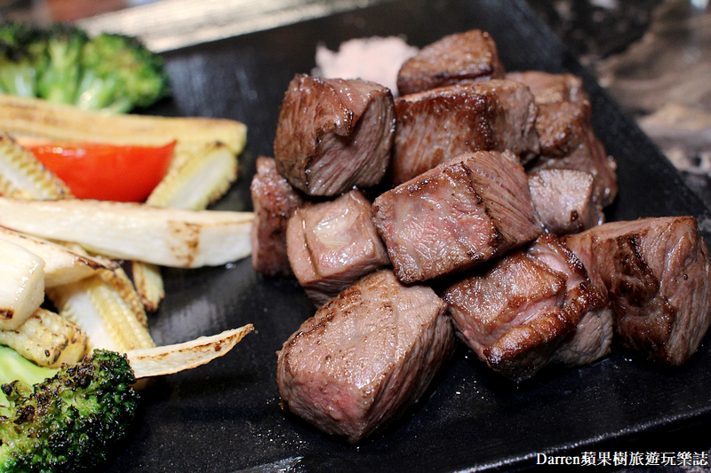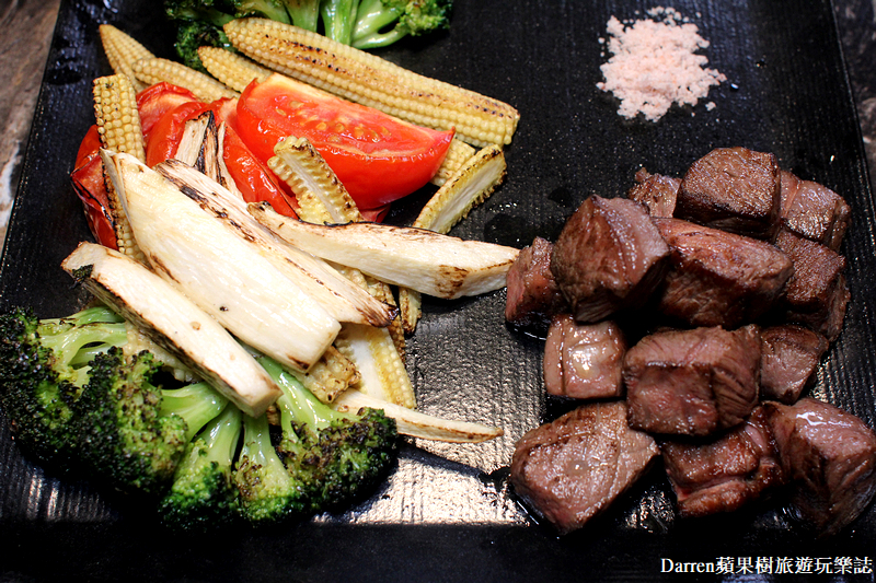 ▲▼香煎美牛佐時蔬,香煎美牛切成如有放大版骰子牛般的大小,Q彈扎實鮮嫩多汁,沾點海鹽就不錯,也別忘了旁邊的蔬菜可以搭配一起食用