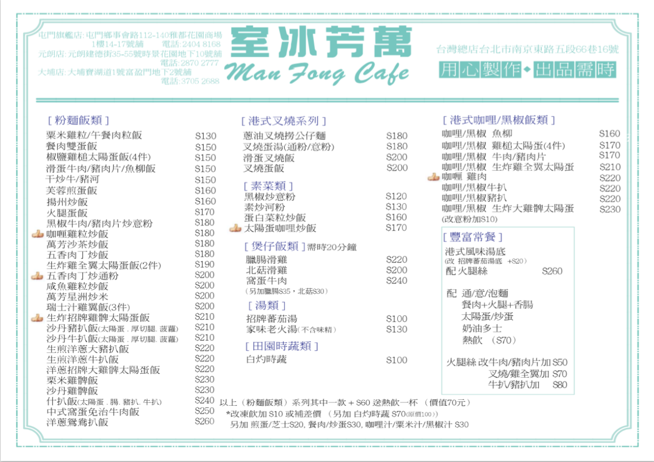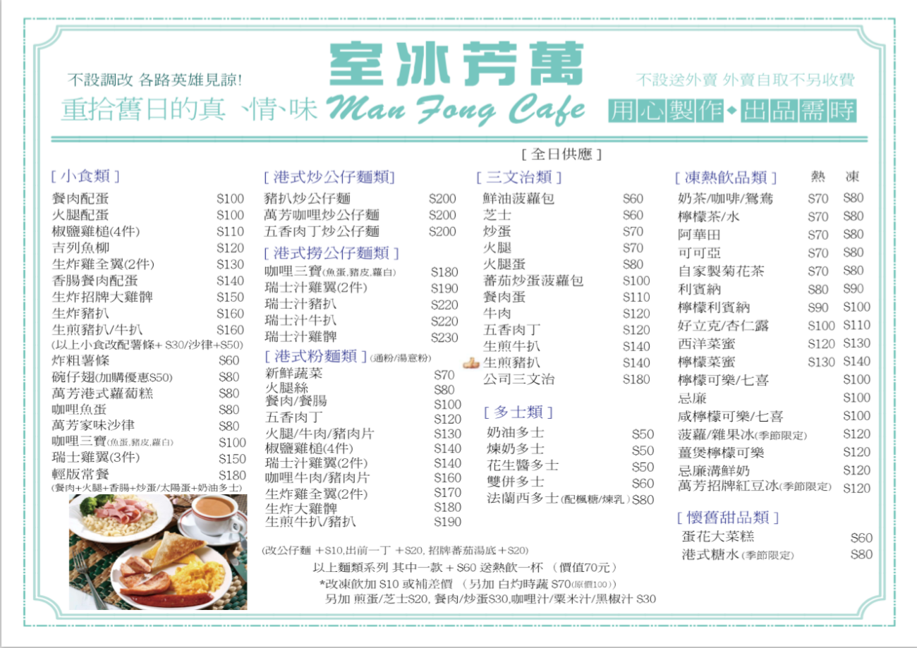 ▼萬芳冰室的菜單設計與餐點內容都複製香港總店,也難怪讓在台生活的港人,如同回到家鄉。菜單種類有小食、港式炒公仔麵、港式撈公仔麵類、港式粉麵類、三文治類、多士類、凍熱飲品類、懷舊甜品類、粉麵飯類、港式叉燒系列、素菜類、煲仔飯類、湯類、田園時蔬類、港式咖哩/黑椒飯類、豐富常餐,可加購熱飲或是凍飲補差價。