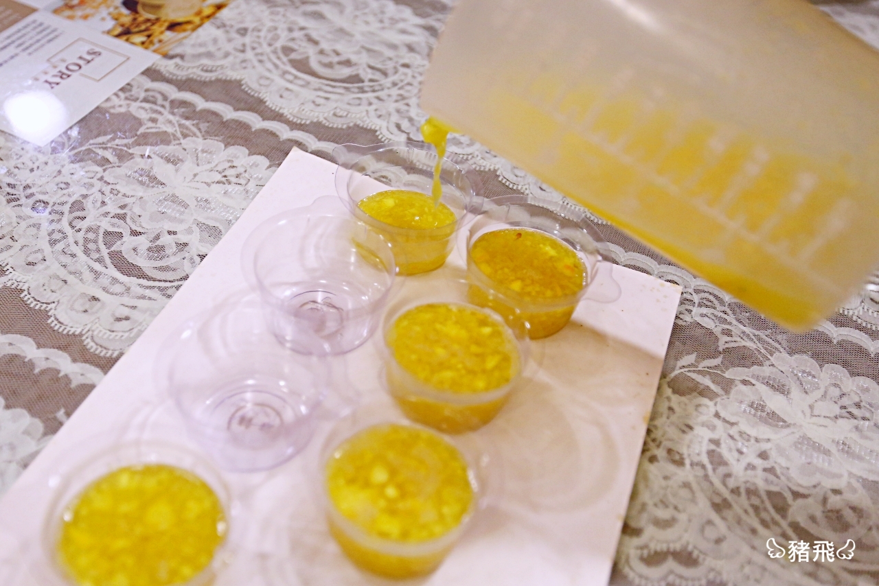 ▲把新鮮柳丁用果汁機打成丁狀後倒入圓形模具,就完成帶有果香的柳丁香皂。