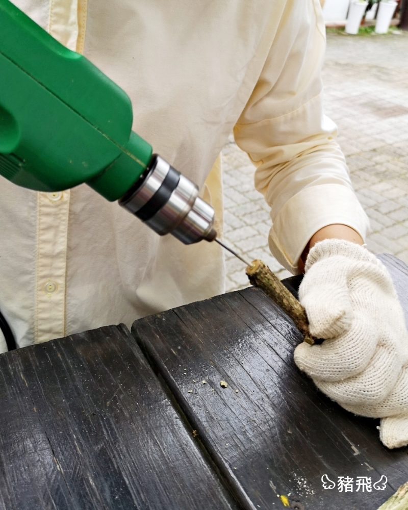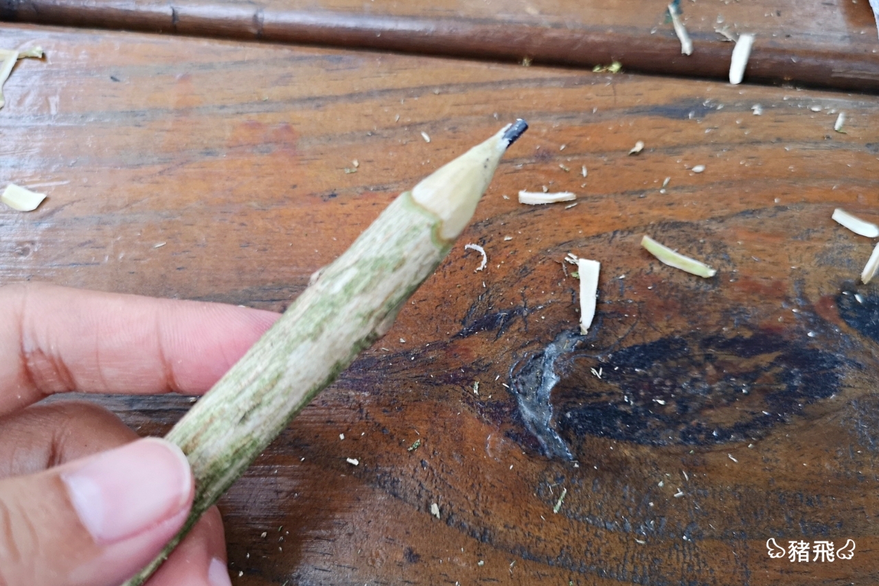 ▲把固體鉛芯塞入樹枝中心已經鑽好的洞,這個其實有點技巧耶,很容易折斷筆芯。