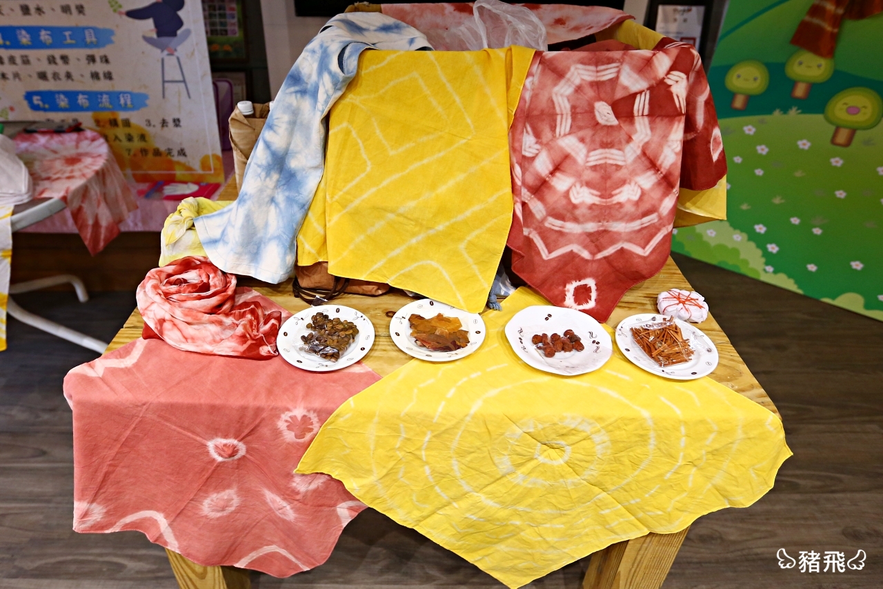 台灣很多地方有藍染體驗,但植物染倒是頭一次聽到,其實這個跟藍染的方式挺像的,最大不同是把可以用來染色的植物拿來做成染色原料,像是中藥的蘇木可以染淺咖啡色,梔子花種子染出來是鮮黃色,洋蔥皮染出來是棕紅色,咖啡豆染出來是深咖啡色。首先憑感覺把白布透過創意綁的方式,用竹筷、彈珠、橡皮筋當道具,綁成各種不規則型,再放入染料煮40分鐘,前後不用一小時,獨一無二的植物染就大功告成,超美的啦!