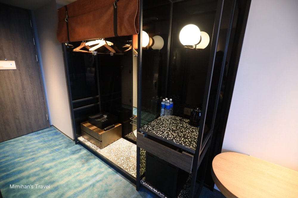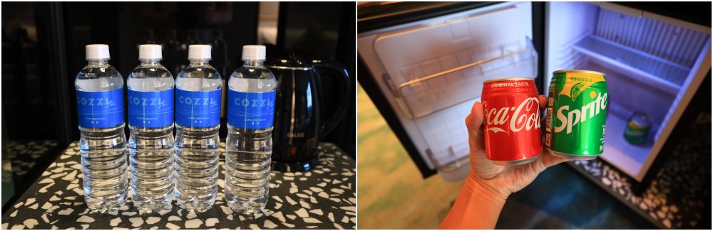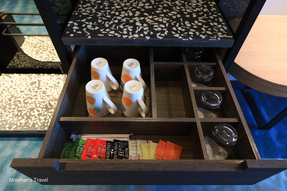 Mini bar上有瓶裝水、快煮壺,抽屜裡準備了咖啡茶包、杯子,另外冰箱飲料免費提供