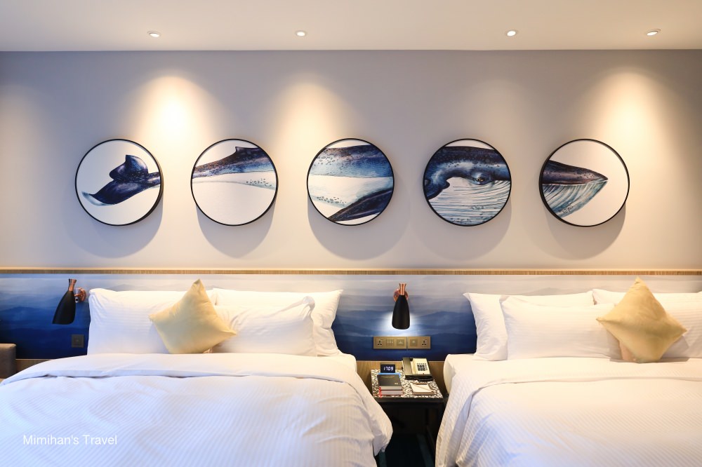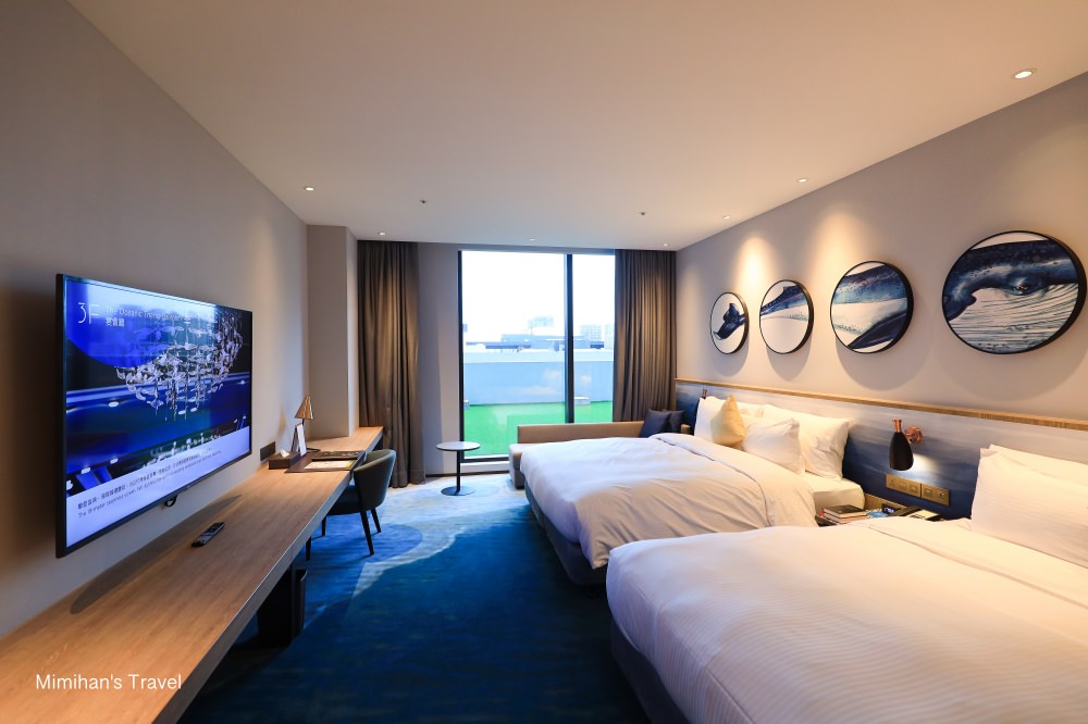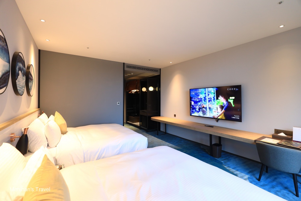 我們這次入住的是COZZI Blu和逸飯店桃園館-和逸客房,看官網有一大床和兩大床的房型,湛藍色的客房地毯,加上圓形窗戶的海魚掛畫,看起來就身處在深海裡,一條巨大的藍鯨正從船艙外面游過去,好喜歡這樣的設計。