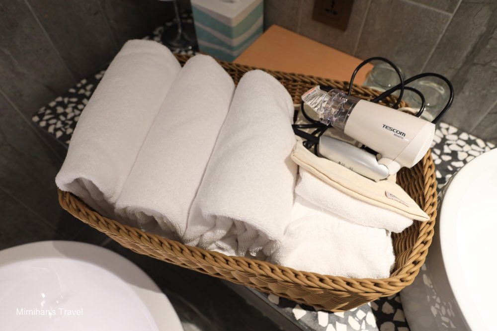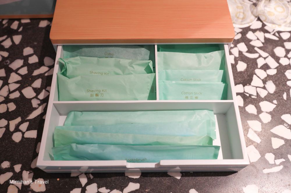 洗手台上的盒子裡有牙膏牙刷、刮鬍刀、棉花棒等衛生備品,不過這些東西我們現在都習慣自備,幫地球減塑也是很重要的啊!