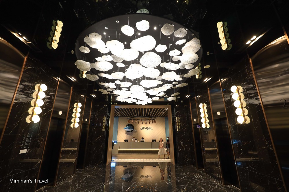 COZZI Blu和逸飯店桃園館的LOBBY大廳位於二樓,電梯打開就看到挑高空間裡掛著整座漂亮的水母造型燈具,彷彿水母悠游其中相當吸睛,此時也拉開海洋主題飯店的序幕。