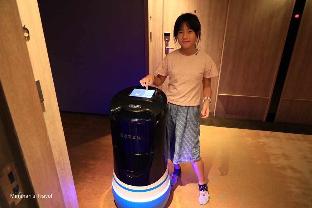 COZZI Blu和逸飯店桃園館另一個有趣的點就是客房服務,我們晚上的時候瓶裝水喝完,就打電話請服務人員送上來,想不到來敲門的竟然是「企鵝機器人」捏!抵達前還會自動來電話通知,我們按面板取出礦泉水之後,他還會自動搭電梯回一樓充電,大家可以玩玩看。
