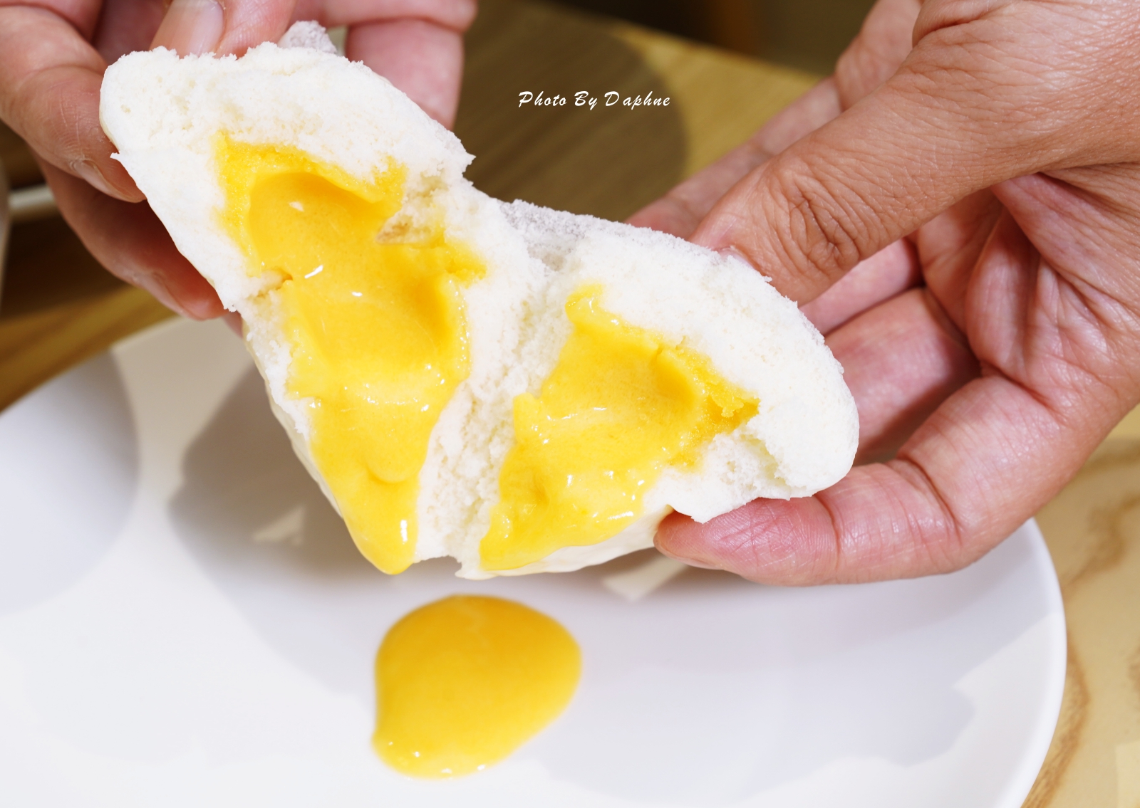 流沙奶皇包曾獲得蘋果日報年菜點心評比冠軍,麵皮香甜,細軟不黏牙,翻開內餡,鴨蛋蛋黃製作成的流沙奶皇餡爆漿流出,餡滑香濃,乳香中帶有一點鹹度,鹹甜得宜,調製出的稠度適中,不會濃稠到顯得膩口,還有微微的流沙顆粒感,不因放了一段時間而影響口感,光這餐就吃兩顆了(遮臉)。