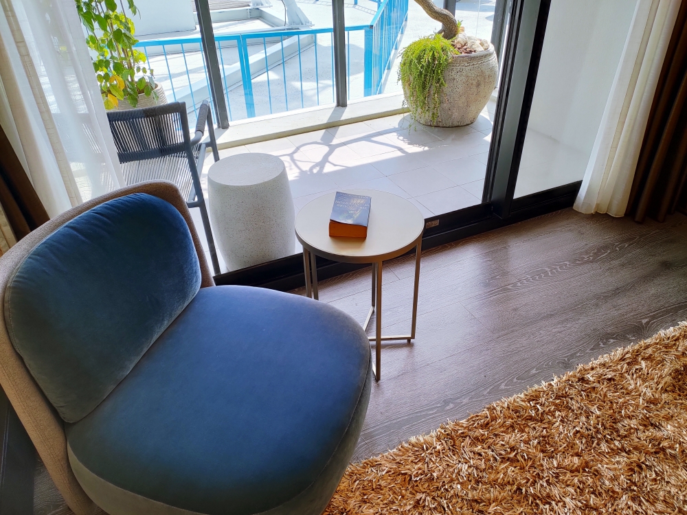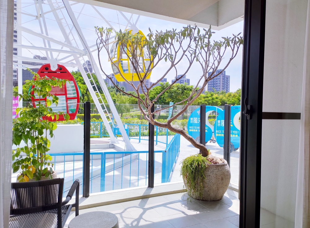 寬敞的前陽台能放盆栽美化,即使不放,通透的陽台玻璃讓住戶一眼就望見藍天綠地,不出門,光待客廳也心境寬闊,這是刻意不做女兒牆遮蔽,讓住戶隔著玻璃能欣賞到戶外景色。