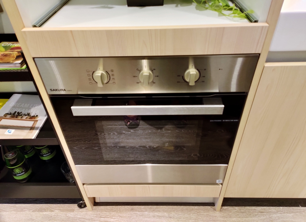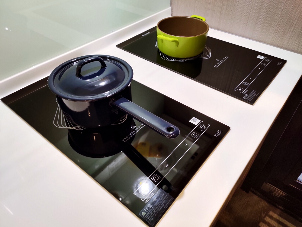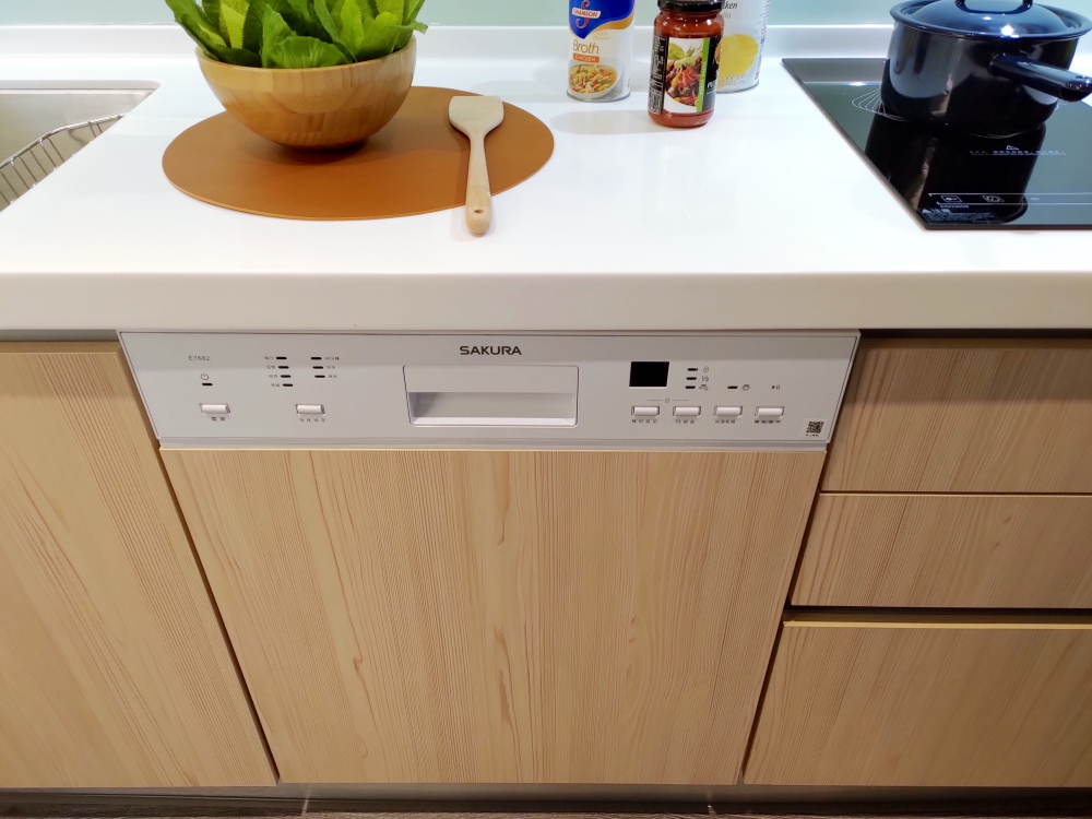樣品屋裝潢僅供參考無附送,而廚具則是標準配備,選用知名品牌櫻花的廚具:單口 IH 感應爐x2、嵌入式電烤箱、半嵌入式洗碗機、電器櫃,如購賣的是53坪,還附有中島。