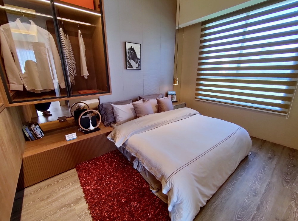 我們參觀接待中心內的樣品屋,這是面向風禾公園,處於公園第一排的 53 坪四房樣品屋,另有規劃 35/39 坪三房、3+1房 44 坪。除了 35 坪無前陽台,其他坪數前後都有陽台(景觀陽台與工作陽台)。44 坪以上就擁有面向公園景觀。以 53 坪來說,一共有三套衛浴,其中一套是公用,另外兩套衛浴分別在兩間套房。