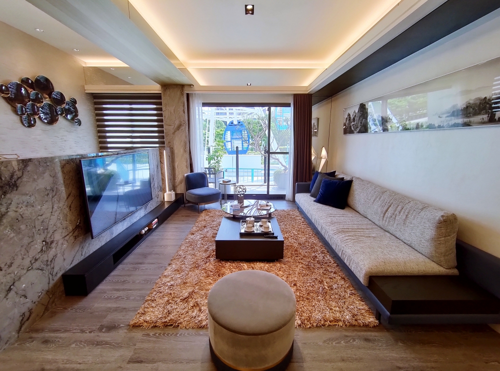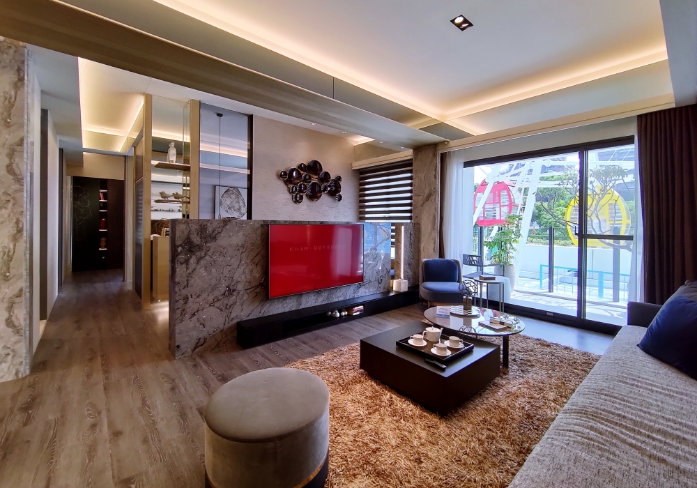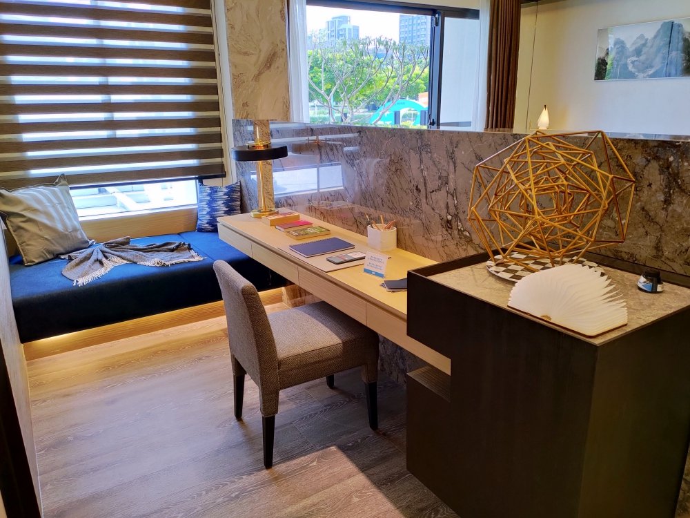 由於是做樣品屋展示,電視後方的牆可自行決定要留下,或是打掉做第四房,也可以打掉讓客廳更大。不過小恰覺得這樣的規劃不錯,在客廳旁邊隔出來一處景觀工作桌與景觀沙發區,可以在這裡邊工作邊與家人交談,小孩在客廳玩也能就近照顧到,還有一處放鬆的小天地。