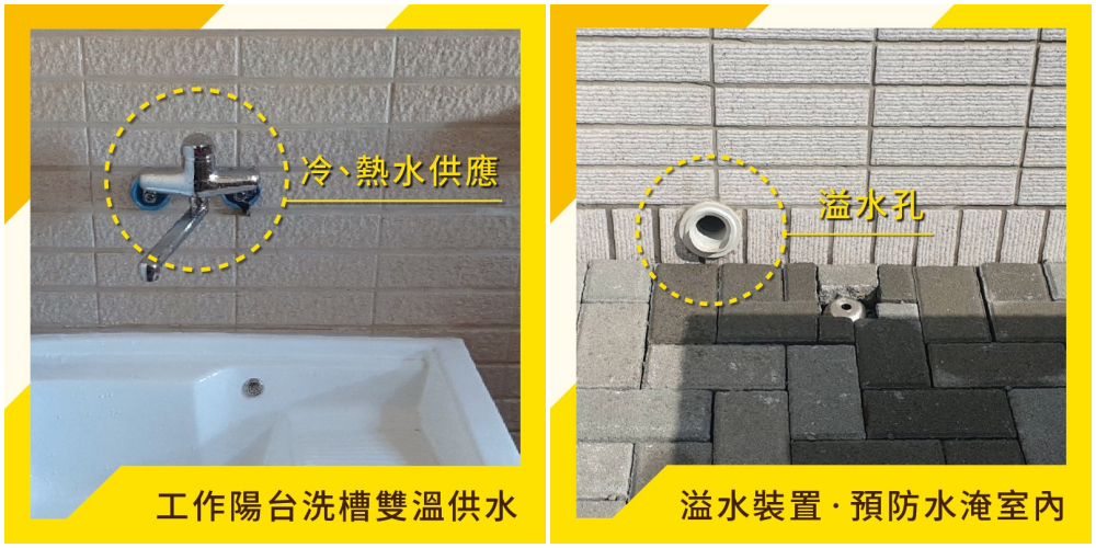 另一點則是開放空間陽台,當遇到颱風或是豪大雨,可能會發生排水不及或排水管阻塞的狀況而造成淹水,甚至水會淹入室內造成損失或是清理時的困擾。這點也設想到了,在陽台設置「溢水裝置」,當有發生淹水狀況時,讓水先從溢水孔排出,不會造成淹入室內,溢水孔加入瀉流板設計,避免排水時弄髒外牆。