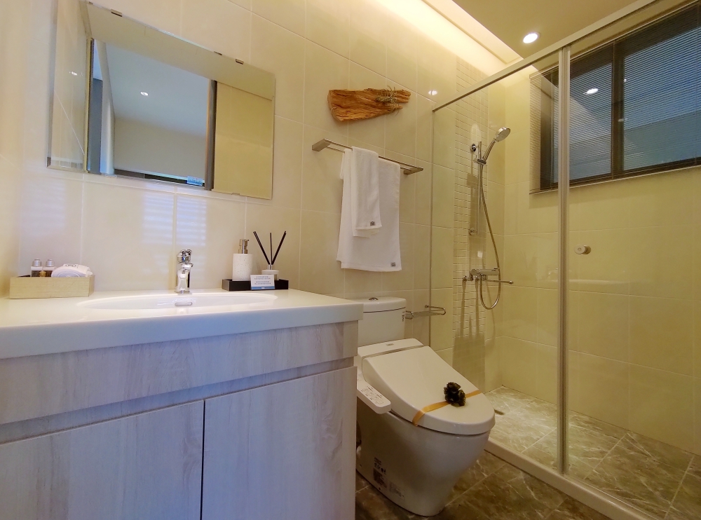 主臥與客臥都有對外窗,比較不會造成潮濕,導致發霉或滑倒。在潮濕的北部,通風與排水真的太重要了,很多住北部的人都得買上兩三台除濕機放在家裡除濕,當住在通風與排水好的住家,可省去一些困擾。