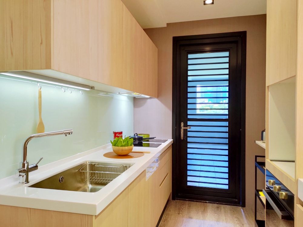 豐邑風禾全數規劃開放式廚房,與客廳、餐廳相連,在視覺上,空間更大,當然也可以按照自己喜好來裝潢規劃。廚房地板加設地板排水裝置,並加裝「上不來落水頭」與「防臭水封設計」,不怕水管受到異物堵塞與發出異味。