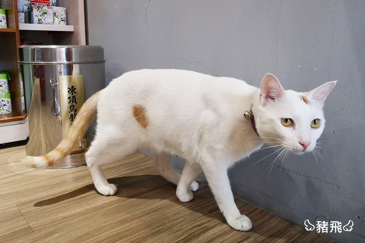 店內的空間不大,以外帶或外送為主,有些客人會特地來買茶,有時間的話很推薦可以坐下來點上現泡單品茶。簡單的大理石色系吧台,搭配周圍木質元素,簡單素雅。店貓勾錐實在太可愛了!會在一旁陪著客人喝茶,白帥帥的勾錐長得很健壯,看的我很想熊抱上去。
