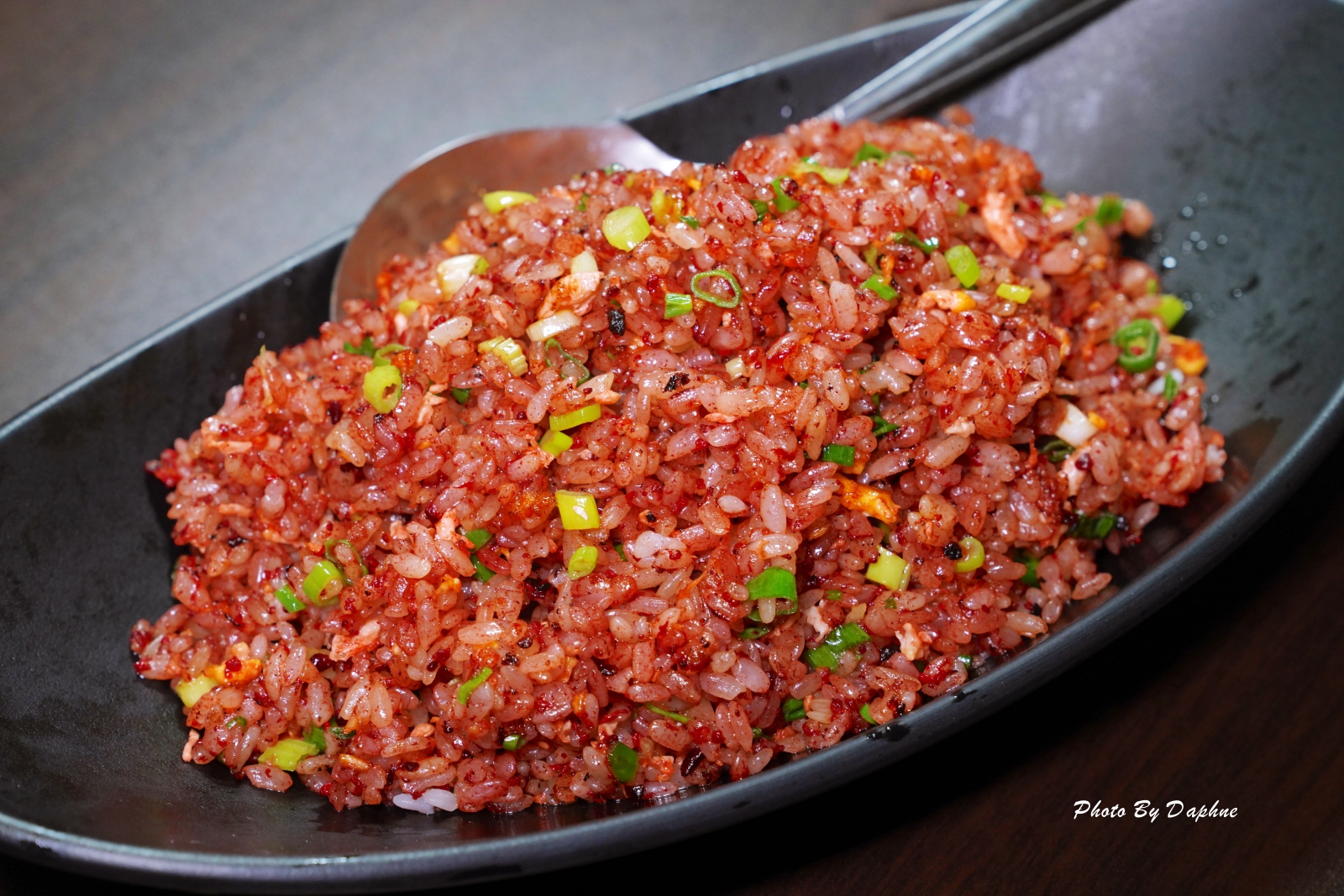 紅槽炒飯的紅糟,是紅麴酒發酵後,將酒濾出所剩下的原料。炒飯炒得鬆散不沾粘不油,在傳統炒飯的焦香之外,嗅得出幽微香氣。