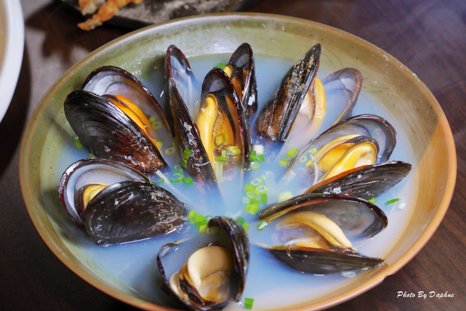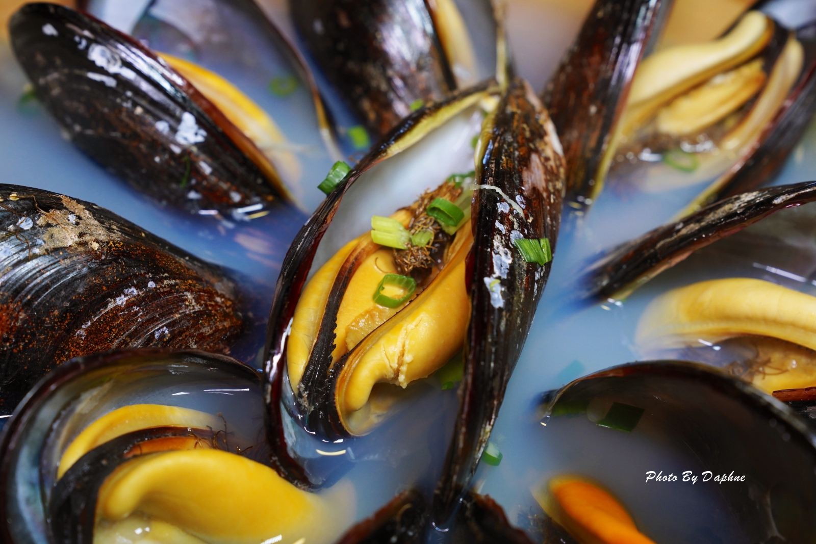 淡菜肉質飽滿鮮美,汁液多,帶鬚的最新鮮,湯不需要特別佐料調味,加入薑片跟九層塔就足以提香提鮮。另有五味淡菜的調理手法。