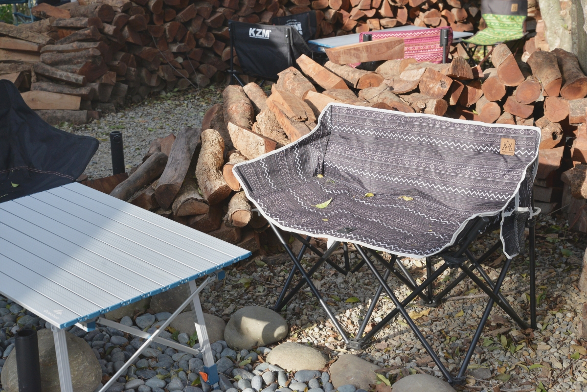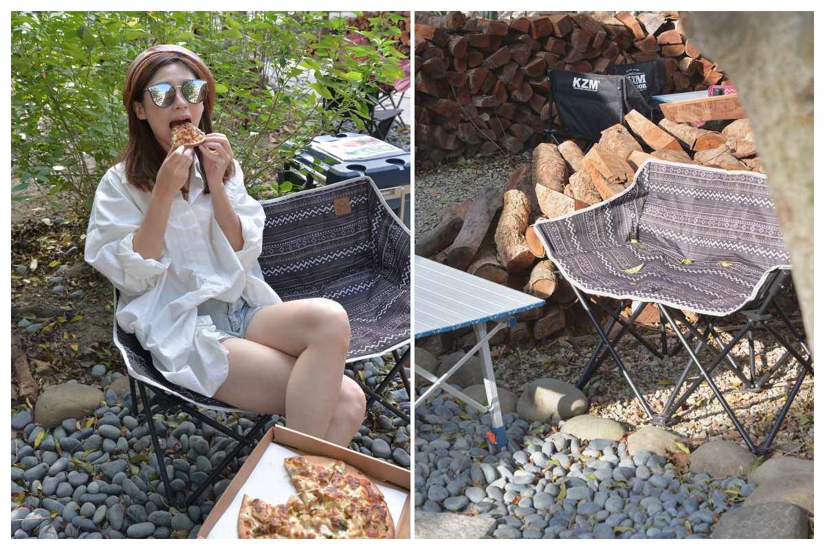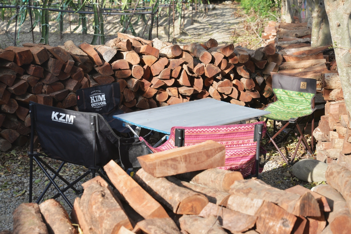 戶外用餐座位就是簡單的蛋捲桌與露營躺椅,看到的時候實在覺得很親切!因為就像我們去露營使用的桌椅一樣,四周放滿木柴,在秋日微風與暖陽的陪伴下,已經等不及美味上桌了!