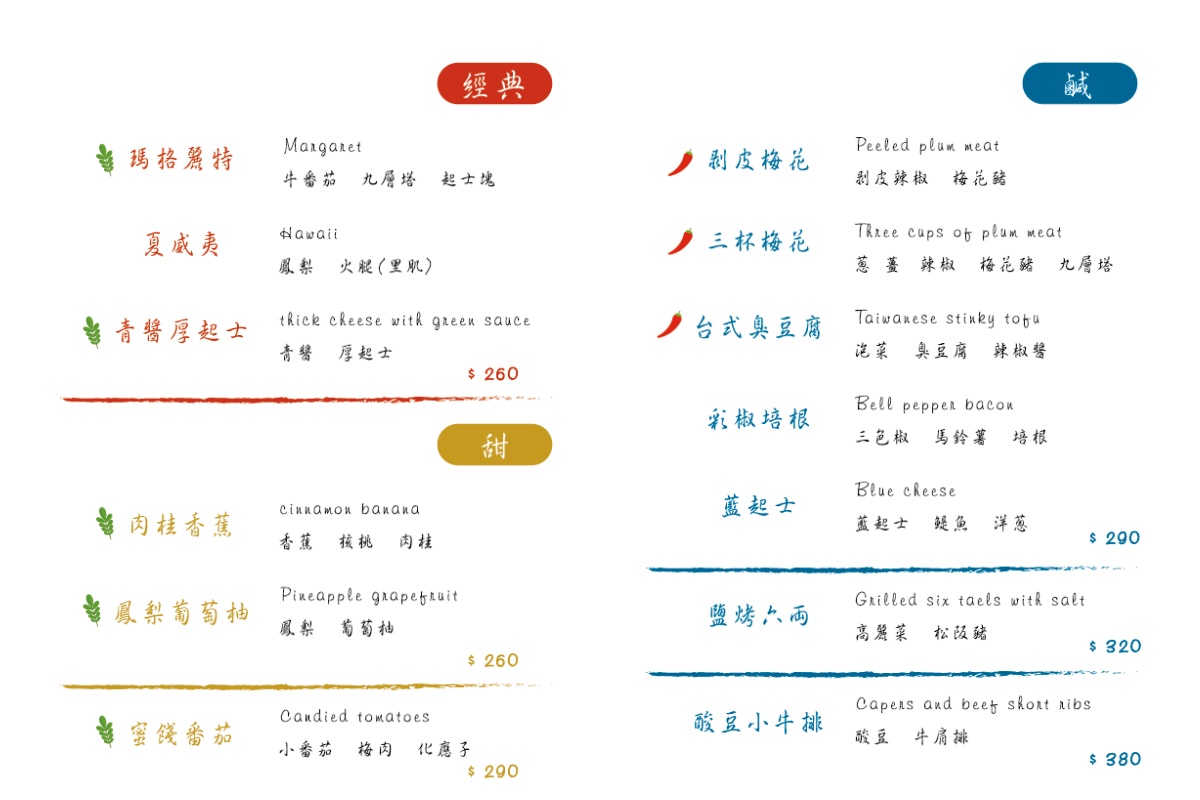 Pizza shalom 提供的餐點都是柴燒窯烤披薩,你們沒有看錯,以上餐點內容不論是孜然羊肉還是日頭菜脯蛋,又或是讓人遲疑的麻辣燙系列,不要懷疑,這些全部都是做成披薩的口味!中西合併的非常徹底,我們猶豫了好一下,因為看起來都好特別好想吃哈哈哈哈!