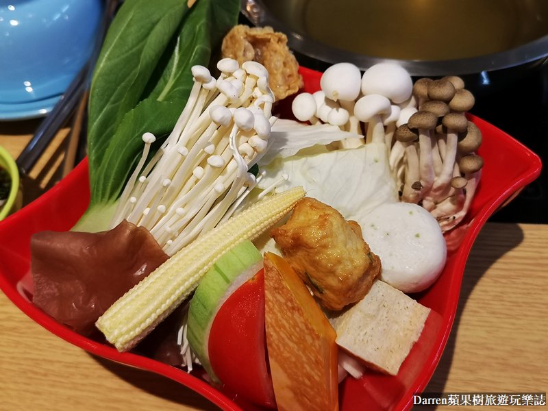 基本菜盤,裡頭的蔬菜菇類是家樂福配合有產銷履歷的蔬菜,要讓客人在食安方面可以吃得安心,第一輪把菜盤通通放入鍋內,就已經是滿滿一鍋,不論是蔬菜或菇類都算新鮮