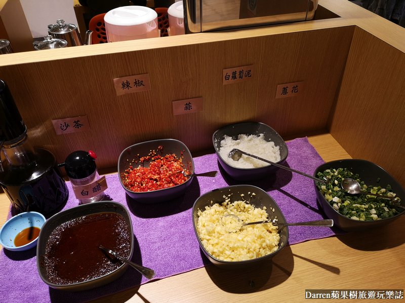 醬料區基本都有,沙茶、辣椒、白醋、白蘿蔔泥、蔥花、蒜泥、醬油等