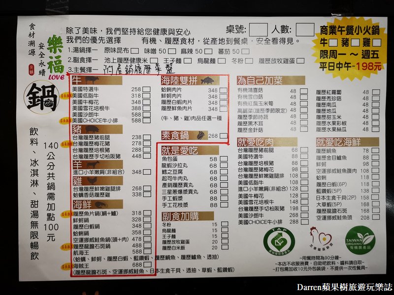 家樂福火鍋店樂福鍋菜單MENU,以單點為主價位算是很親民,商業午餐小火鍋平日午餐198元冰淇淋甜湯飲料吃到飽,餐廳內主打產銷履歷菜盤,副食有池上履歷健康米、履歷放牧雞蛋等可以選擇,從產地到餐桌都看得見的自家產銷履歷溯源餐廳