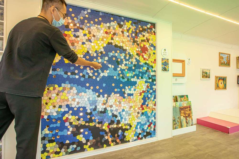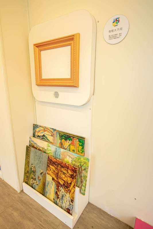 再來,像是這個有框大不同,就是讓大家動手把圖畫跟畫框組合裡來,以一種遊戲式的互動裝置,讓大家能看到摸到玩到所謂的新北前輩藝術家經典作品