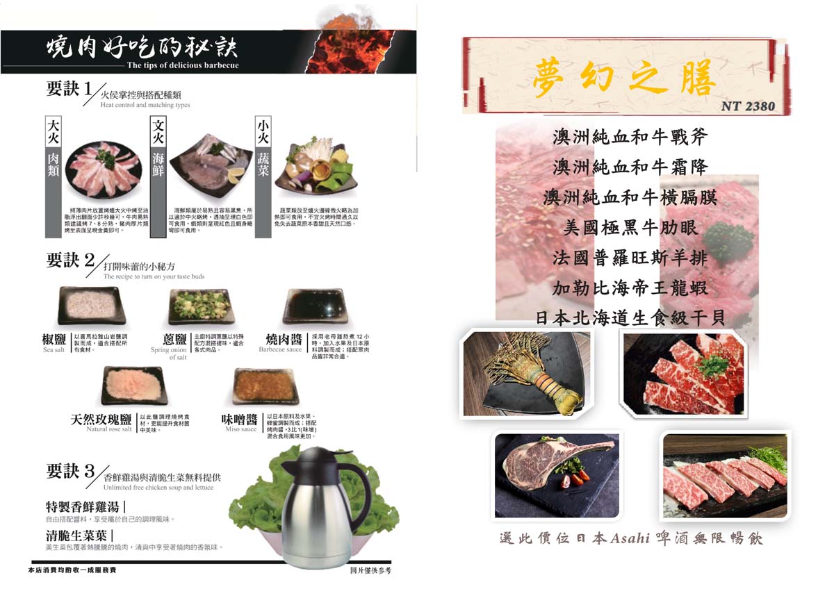 燒肉吃到飽價位:一品之膳499元、上品之膳699元、極品之膳899元、王漾之膳1680元、夢幻之膳2380元