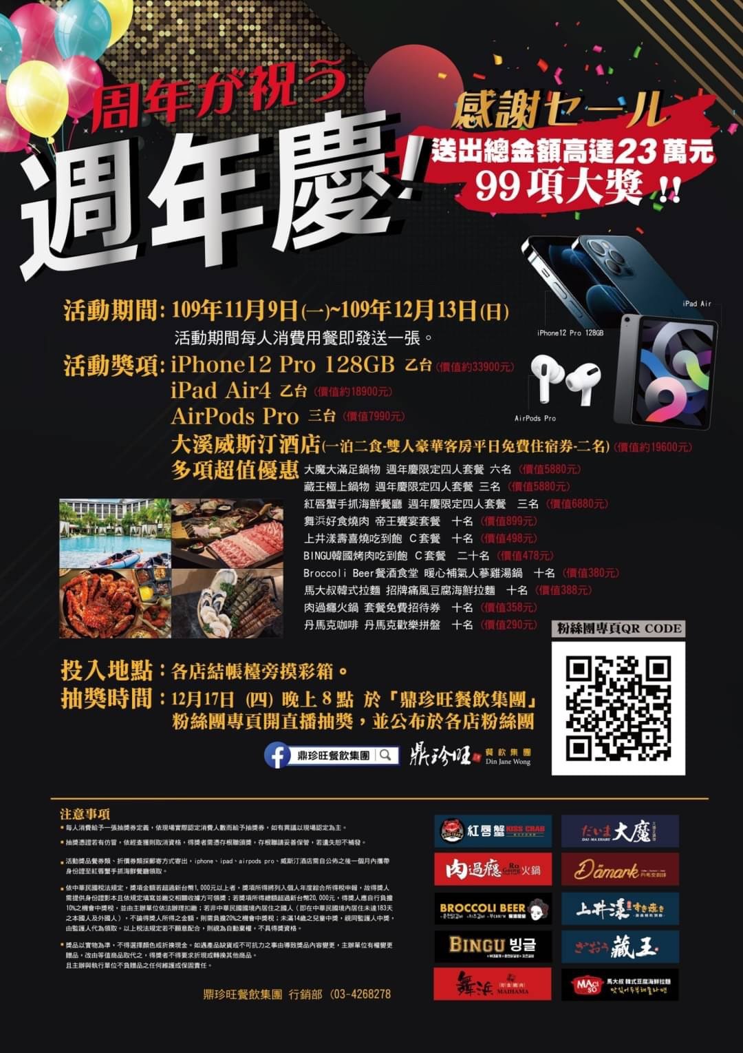 ▼鼎珍旺餐飲集團週年慶活動底加啦~~~自11/9~12/13止,活動期間內只要到旗下餐飲品牌,每人消費用餐即送一張摸彩券,就有機會獲得iPhone 12 Pro 128GB、iPad Air4、AirPods Pro、大溪威斯汀酒店一泊二食雙人豪華住宿券、餐券等多項大獎,有興趣的朋友要吃要快啊!抽獎時間為12/17晚上8點在「鼎珍旺餐飲集團」粉專直播抽獎,大家千萬不要錯過啦!!