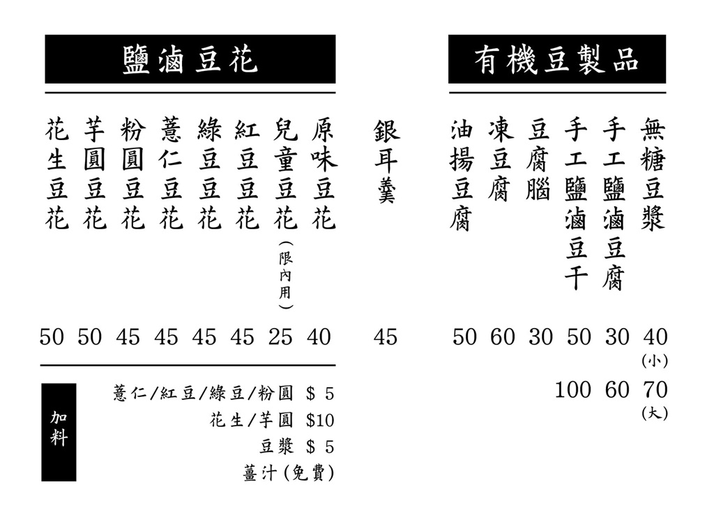 提供鹽滷豆花、銀耳羹,無糖豆漿、鹽滷豆乾、鹽滷豆腐等有機豆製品。